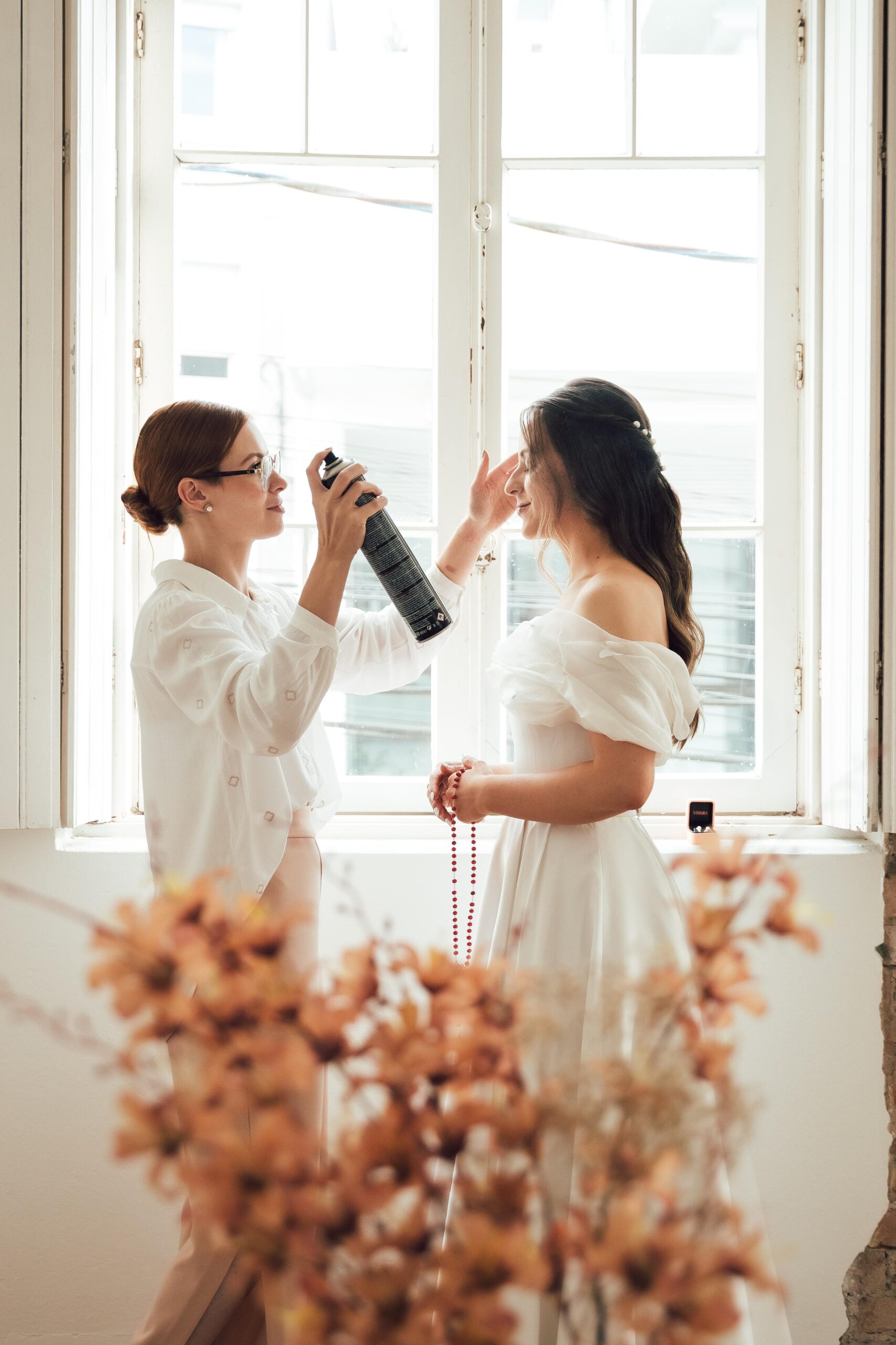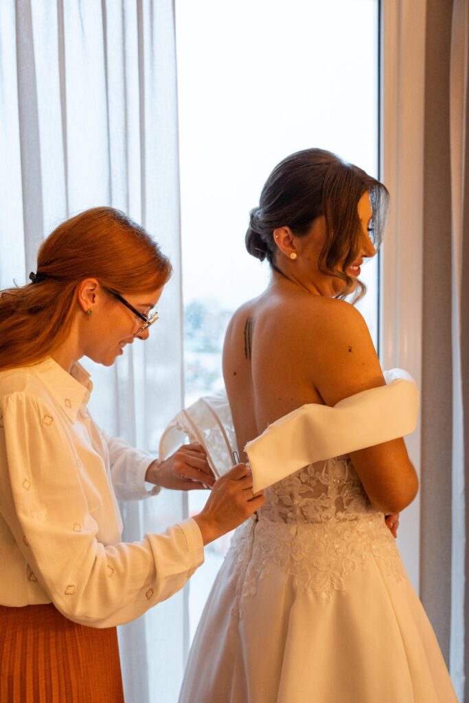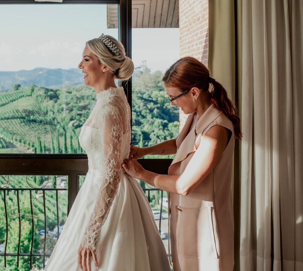 Vestir, colocar os acessórios, posicionar para as fotos e o principal, manter a noiva tranquila, sempre sensível para orientar emoções, como uma melhor amiga faz. No grande dia, todos os meus cuidados estão voltados para a noiva, por isso produzidos no máximo mais uma acompanhante (penteado e maquiagem). Para familiares e madrinhas disponibiliza a minha equipe, que é altamente especializada e orientada a realizar um trabalho no mesmo estilo que o meu.